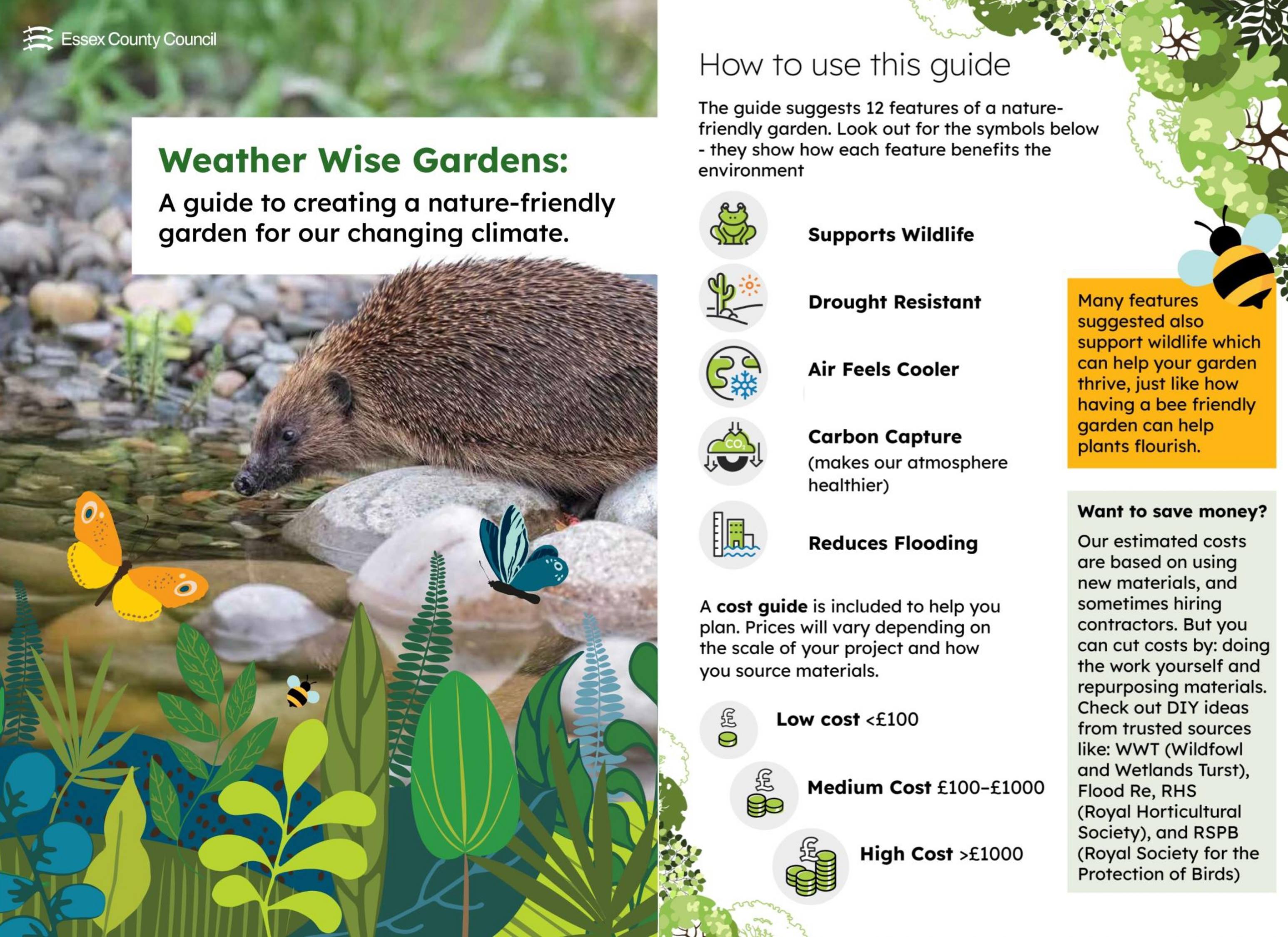 A well-planned garden can help reduce the impacts of extreme weather while helping nature thrive. Discover 12 features of a happy garden in our leaflet below, as well as some basic installation and shopping guidance.